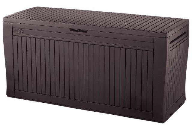 Il Comfy Garden Storage Box può contenere fino a Serbatoi0 L / 71 G al suo interno e può supportare fino a 220 kg / 485 libbre sul suo coperchio, che può fornire spazio di seduta spesso necessario. Questa soluzione di archiviazione multiuso è resistente e realizzata con una resina resistente alle intemperie e presenta maniglie e ruote incorporate che ne facilitano lo spostamento. Può essere assemblato in soli cinque minuti.
