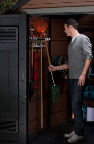 - Il pavimento per impieghi gravosi e la struttura spaziosa lo rendono adatto per riporre oggetti anche di grandi dimensioni, mentre le pareti perforabili facilitano l'installazione di scaffalature o appendi oggetti.