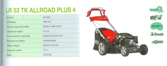RASAERBA EFCO LR53 TK ALL ROAD,SCOCCA IN ACCIAIO,CILINDRATA 196CM CUB.,MOTORE EMAK K 800OHV,LARGH. TAGLIO 51CM,AVANZAMENTO A TRAZIONE,PESO 33,8KG.