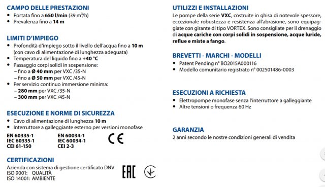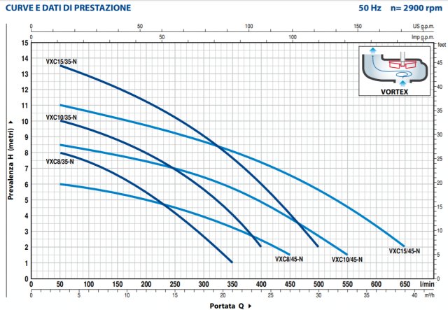 Le pompe della serie VXC, costruite in ghisa di notevole spessore, eccezionale robustezza e resistenza all'abrasione, sono equipaggiate con girante tipo VORTEX.