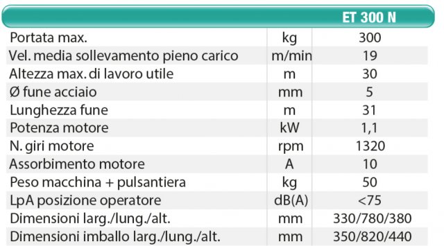 Velocità media di sollevamento pieno carico 19 m/min. Portata max. 300 kg